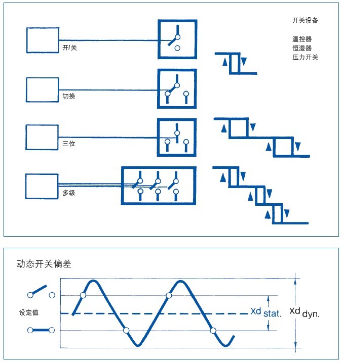 如果系統(tǒng)安裝了開關(guān)型傳感器,例如溫控器,要注意溫度值波動會比溫控器本身的開關(guān)偏差要大。雖然溫控器在樣本中規(guī)定的轉(zhuǎn)換點工作,但是系統(tǒng)慣性(余熱、死區(qū)時間等)會引起受控變量超調(diào)或者欠調(diào),導致最終測量溫度的波動(動態(tài)開關(guān)偏差)會比溫控器本身的靜態(tài)開關(guān)偏差要大。