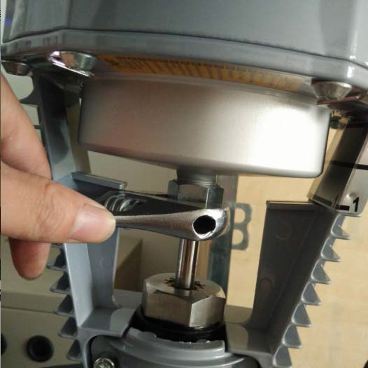 向1方向旋轉(zhuǎn)執(zhí)行器上部搖柄,使其向下接觸到閥桿