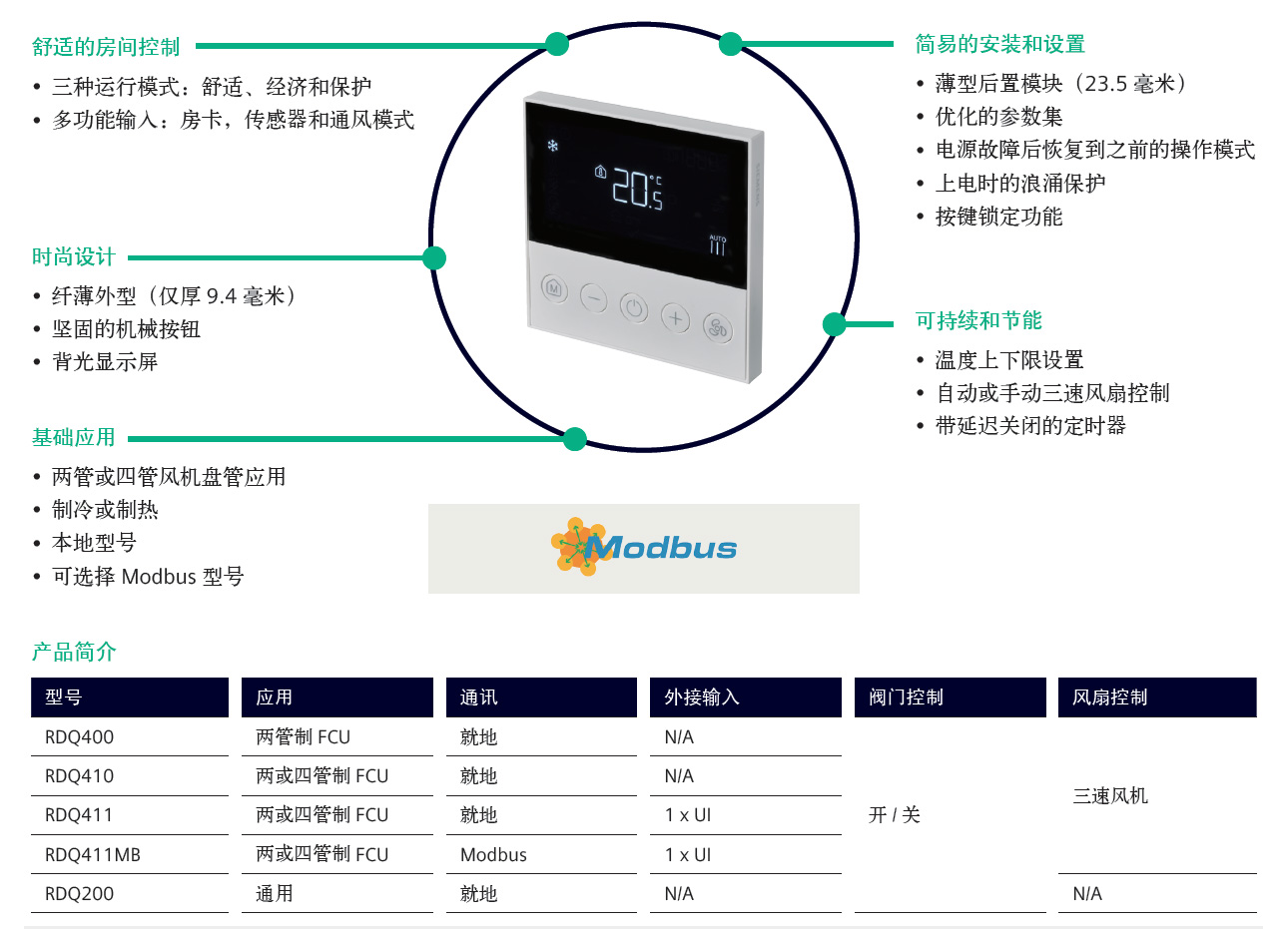 西門子全新RDQ 系列室內(nèi)溫控器,專為各類建筑精心設(shè)計,可用于住宅、商業(yè)樓宇以及公共空間等場景。提供通用開關(guān)控制,適用于2 管或 4 管制風(fēng)機盤管應(yīng)用,可選 Modbus 型號確保系統(tǒng)無縫集成。此溫控器器憑借出色的可靠性和良好的經(jīng)濟性,成為辦公室、酒店、購物中心、學(xué)校以及各種建筑設(shè)施的理想之選。