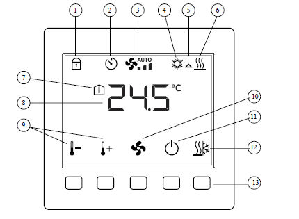 6. 選擇供熱模式 | 13. 5 個按鍵用于調(diào)節(jié)設(shè)定值(選擇控制參數(shù)), 風(fēng)機模式,運行模式,供熱/制冷轉(zhuǎn)換 |