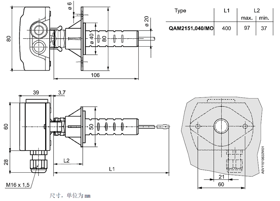 ● 未配備安裝法蘭(使用最大浸入長(zhǎng)度)。按照要求,外殼上的4 個(gè)孔可將傳感器直接安裝到風(fēng)道上